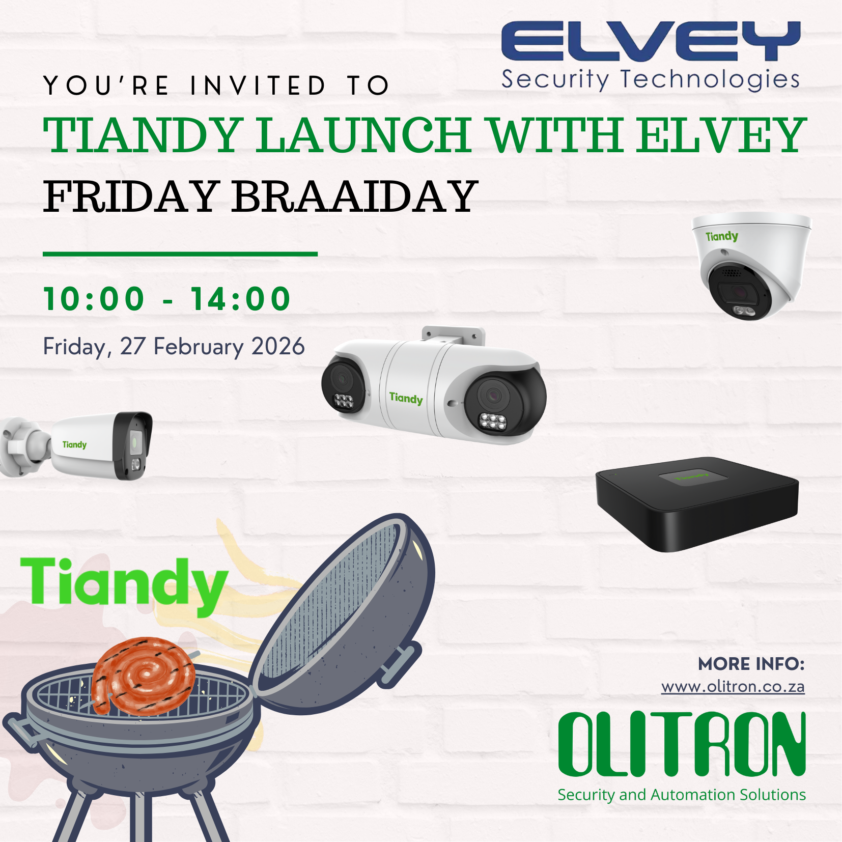 We are officially launching our Tiandy camera sales and teaming up with Elvey Security Technologies, trusted suppliers of Ajax cameras. Expect live demos, expert insights, great networking — and of course, a proper Olitron braai!